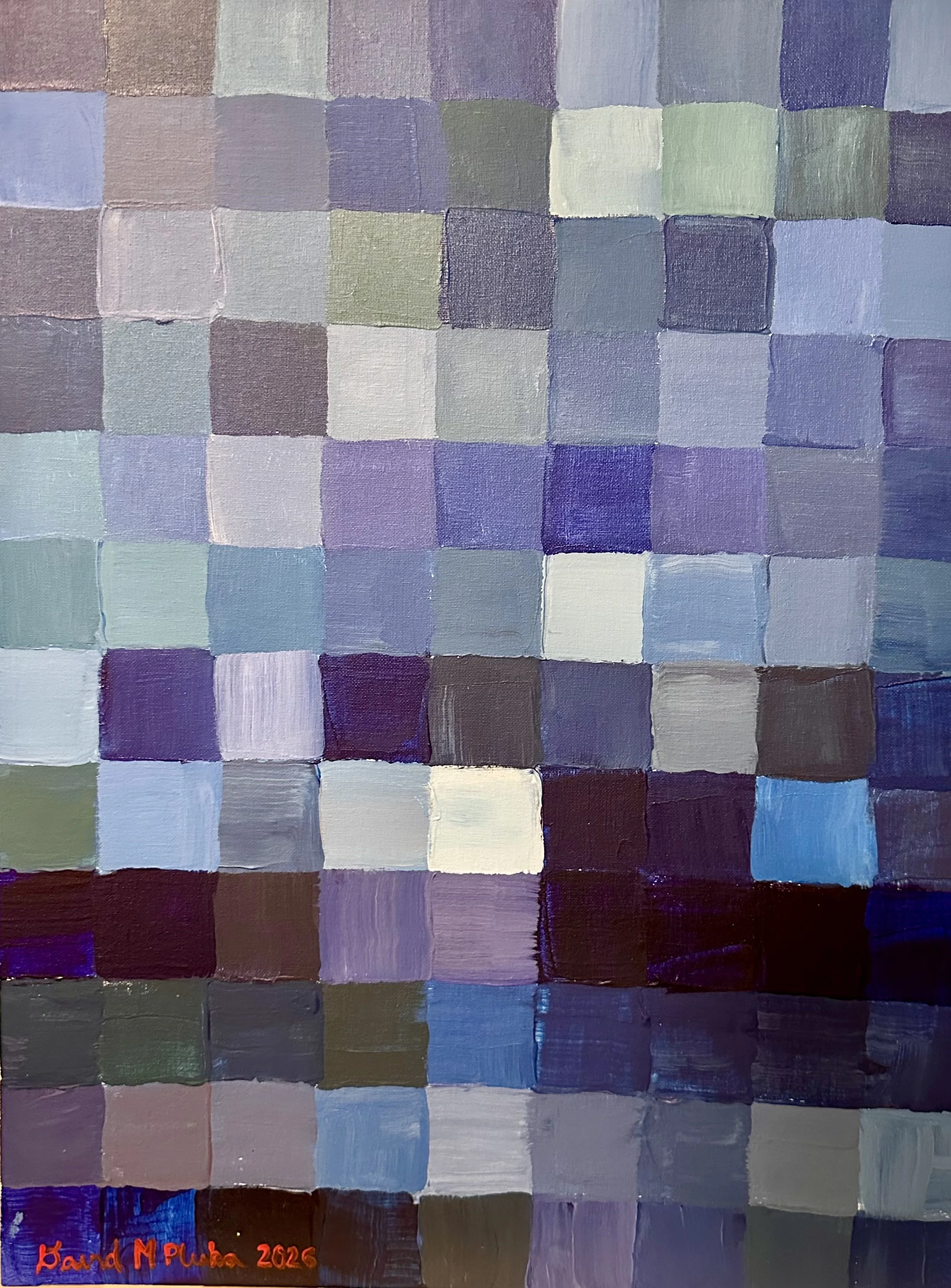 To begin, I divided the canvas into small squares and painted each one a different shade of blue. I tried to make every square unique. The color blue represents sadness, and the variety of blues represents how everyone’s sadness is different, yet similar—because they are all still shades of blue. Since they are all connected by the same color, they reflect how our experiences of sadness connect us to one another. Everyone feels sadness from time to time. The lighter shades represent milder sadness, while the darker blues represent sadness that feels deeper and more intense. Here it is. More later…